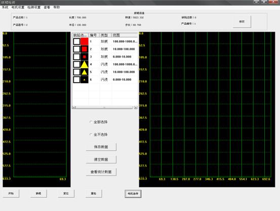 當圖像定位好后,根據檢測區(qū)域內極片表面是否有褶皺、缺口、開裂、掉料、粘料、氣泡、漏箔等缺陷超過設置的灰度差值提取表面的缺陷,并提示缺陷位置及顯示缺陷大小。輸出相應檢測信號。