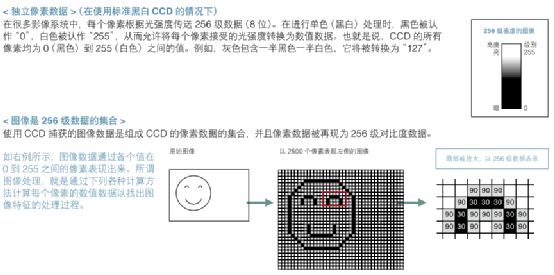 ①相機—像元(也有稱做像素):是成像于相機芯片的圖像的最小組成單位。將圖像放大,每一小格表示一個像元,其中每一個像元對應一個灰度值。以500萬像素的相機為例,滿屏有2592*1944個像素,成像于1/2.5英寸大小的CMOS芯片。