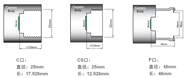 ⑩相機光學接口:即相機與鏡頭的連接方式,業內常用的幾種接口,如C口,CS口,F口,V口等。前面兩種的接口都是螺紋口,后面兩種都是卡口。